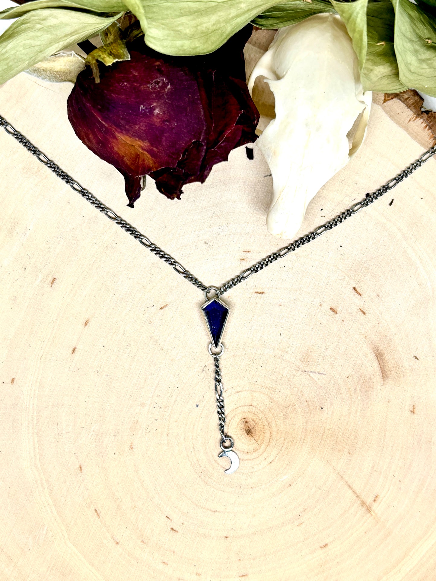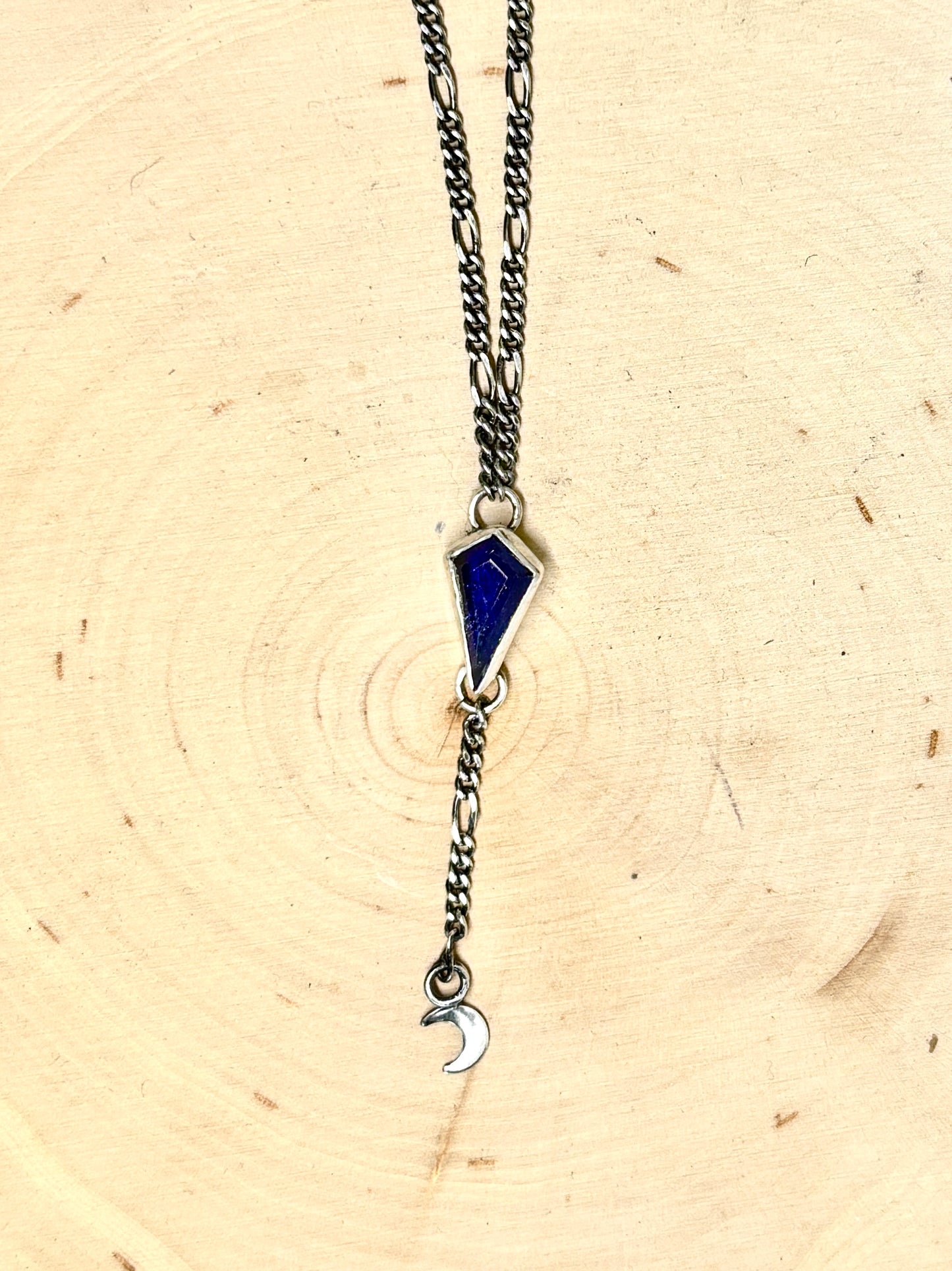 Simple yet elegant, our Midnight Crescent necklace features a dazzling 16'' sterling silver Figaro chain with a beautiful Thailand Sapphire and a delicate Moon charm. The unique lariat design adds a touch of style to any outfit and makes it the perfect accessory for any occasion.